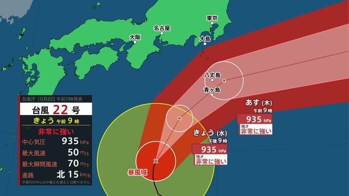 非常に強い勢力となった台風22号は、あす9日(木)明け方から朝にかけて八丈島など伊豆諸島南部を直撃する可能性が高くなっています。気象庁からは暴風と波浪に関する特別警報が発表される可能性があると発表され…
