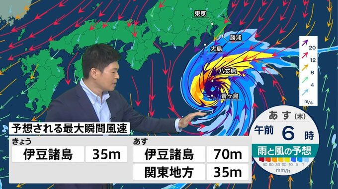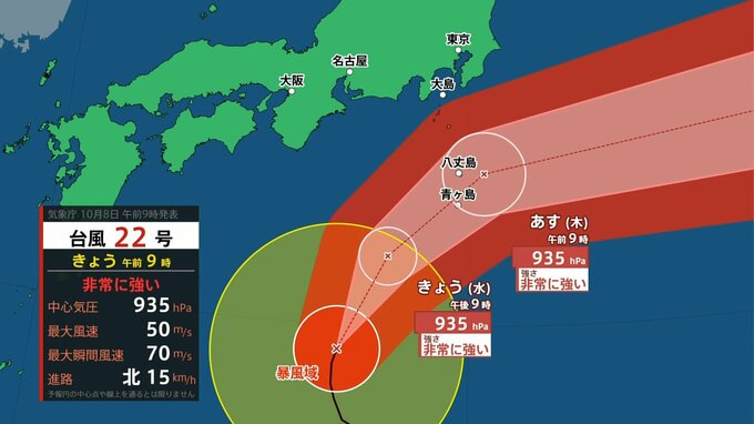また、台風22号は中心付近の気圧が930hPa前後と極めて低い状態で接近することが特徴です。そのため、これまで経験したことがないような暴風が吹き荒れるおそれがあります。特に伊豆諸島南部で予想される最大瞬間風速は、あす9日(木)は70メートルと一部の家屋が倒壊するような大変危険な暴風が予想されています。