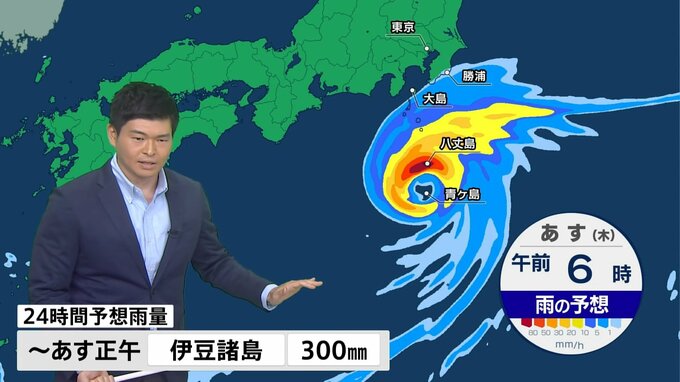 伊豆諸島南部では、きょう8日(水)夜以降に急激に雨足が強まってくるでしょう。特にあす9日(木)未明から明け方ごろを中心に、1時間に80ミリ以上の猛烈な雨が降るおそれがあり、昼前にかけては線状降水帯が発生して大雨災害の危険度が急激に高まる可能性があります。あす9日(木)正午までの24時間に降る雨の量は、伊豆諸島南部の多い所で300ミリの見通しです。大雨災害に厳重な警戒が必要です。