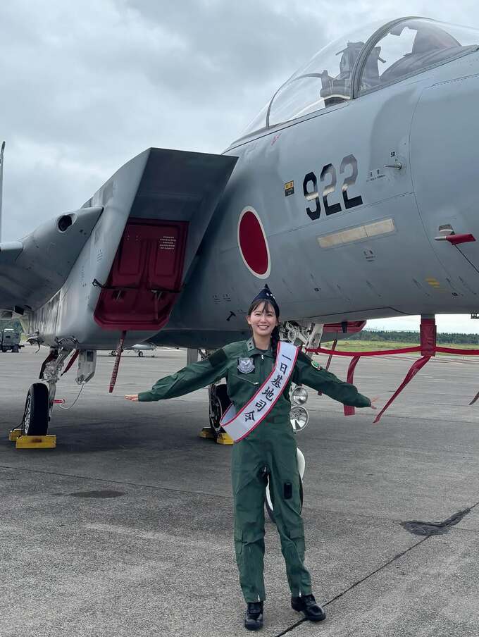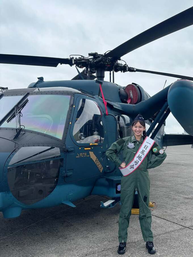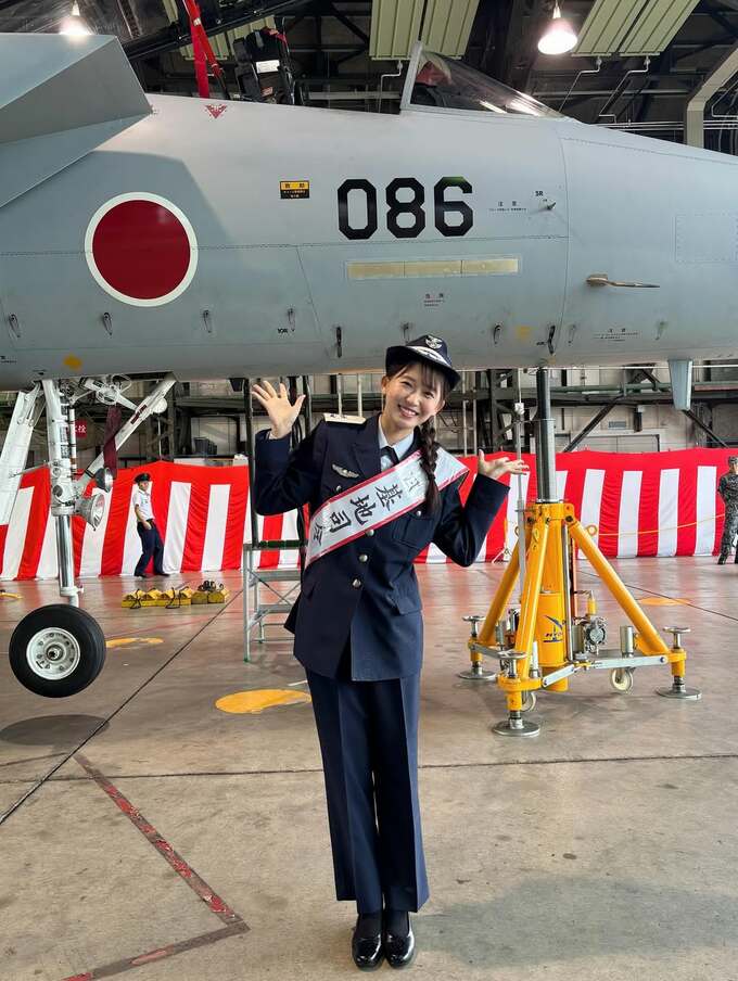 志田さんは、基地内の滑走路や格納庫などを背景に、F-15戦闘機やUH-60J多用途ヘリコプターの前で制服を着て “一日基地司令” のタスキを掛けてポーズを取っています。