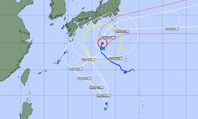 進行方向、速さ 西北西 35 km/h (20 kt)