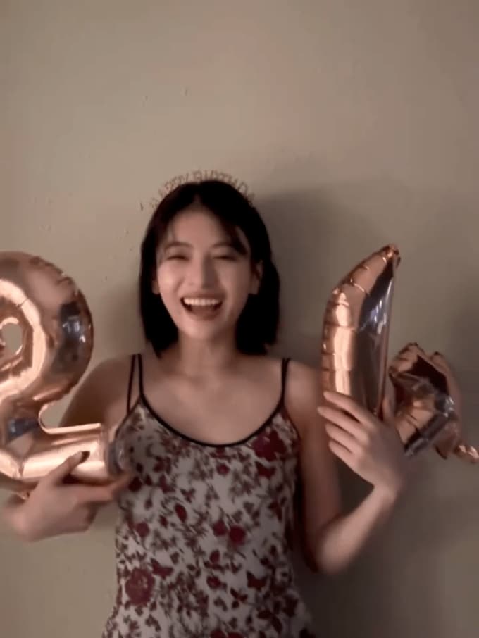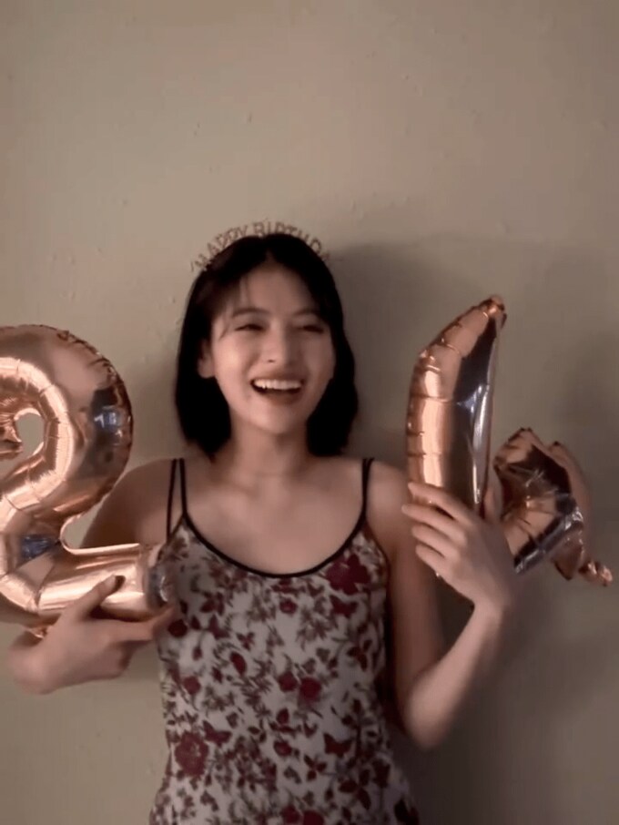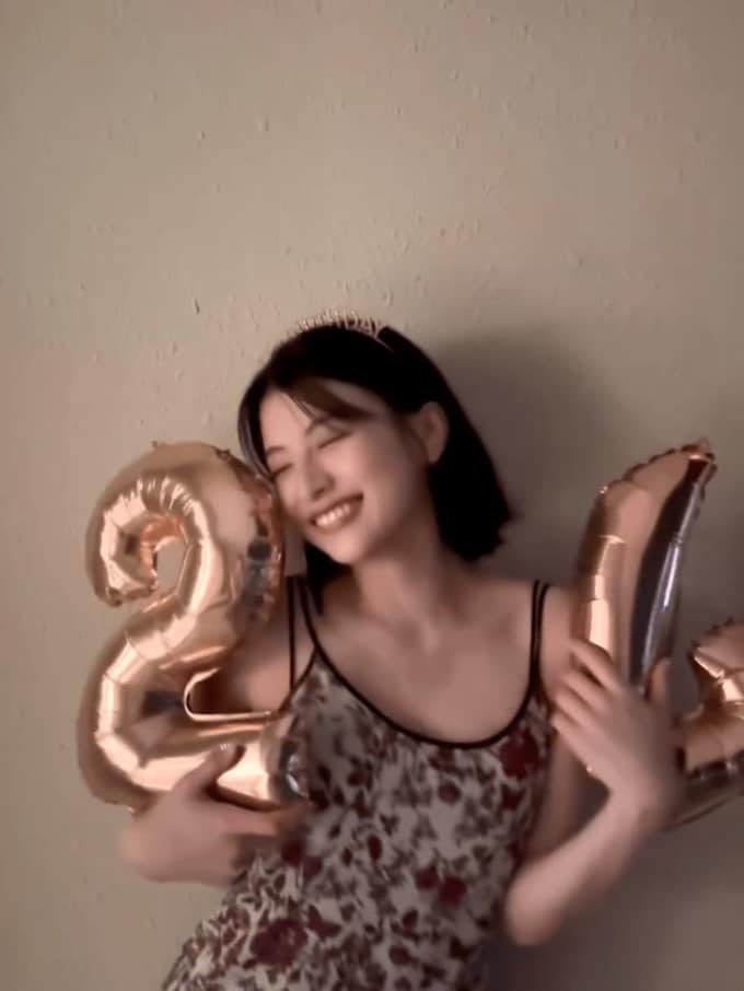 出口さんは「24さいになったよ〜」とピースサインの絵文字と共にテキスト。グレーに赤系の花のパターンがプリントされたキャミソールに「2」「4」のバルーンを両腕に抱え「HAPPY BIRTHDAY」と字が立体で立ち上がったカチューシャを着けて、満面の笑顔でポーズを取る動画を投稿。