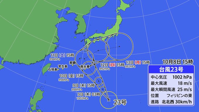 8日午後3時、フィリピンの東の熱帯低気圧が台風第23号になりました。台風は1時間に約30キロの速さで北北西へ進んでいます。中心の気圧は1002ヘクトパスカル、