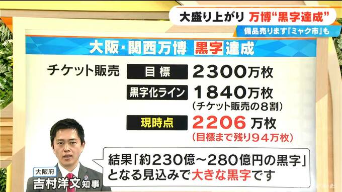 これが現時点で2206万枚売れていて、目標の2300万枚まで残り94万枚。すでに黒字化ラインはクリアしたことになります。大阪府の吉村洋文知事は「結果『約230億円~280億円の黒字』となる見込みで、大きな黒字です」と言っています。