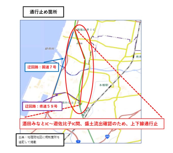 酒田河川国道事務所によると、山形県遊佐町藤崎地内で盛土の流出が確認されたため、10月8日午後1時45分から道路の災害対策支部「警戒体制」を設置し、午後2時30分から、日本海東北自動車道の「酒田みなとIC~遊佐比子IC」間の上下線で、全面通行止めを実施しているということです。