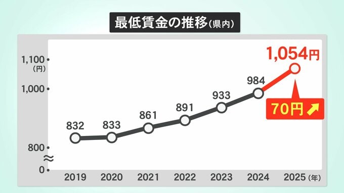 県内の最低賃金は、近年一貫して上昇トレンドにあります。令和元年(2019年)の832円から毎年増額。おととし900円を超えてからは、さらに上昇の勢いが増し、2025年は2024年から70円の上げ幅と過去最大になりました。