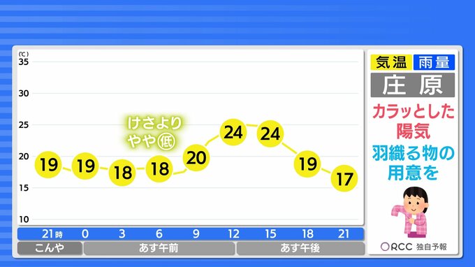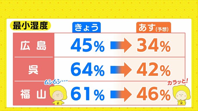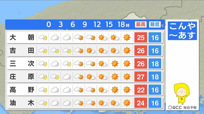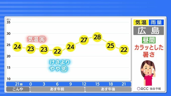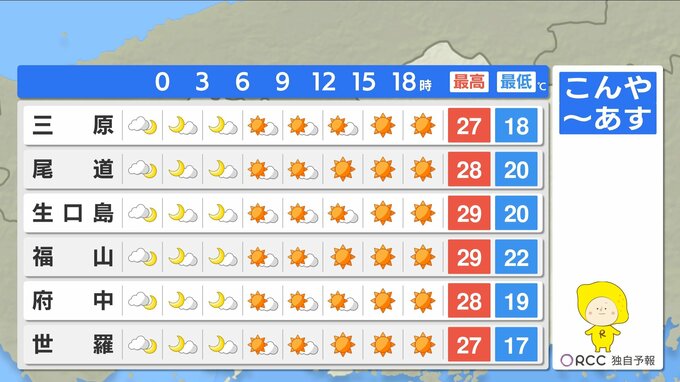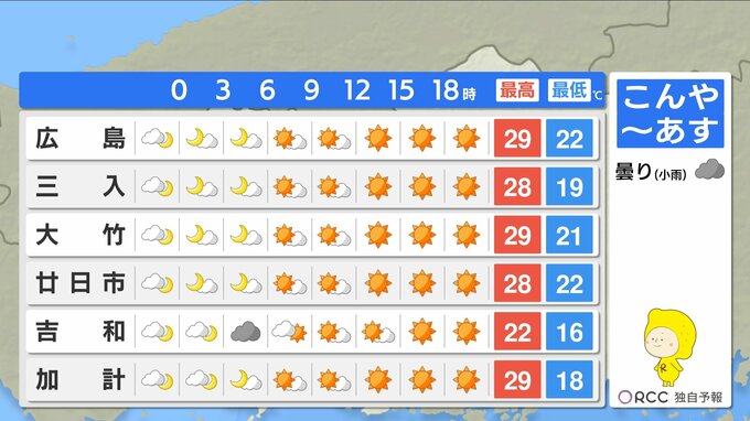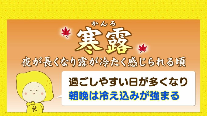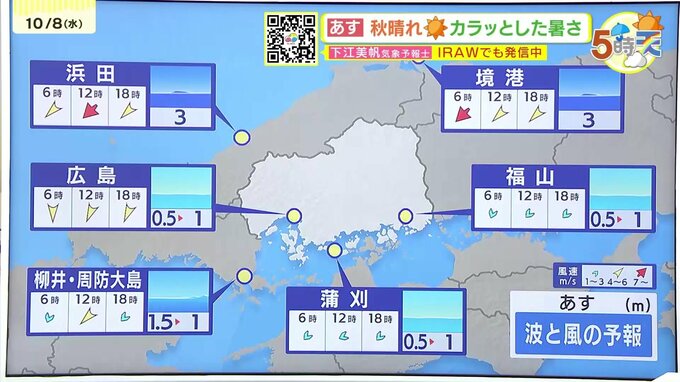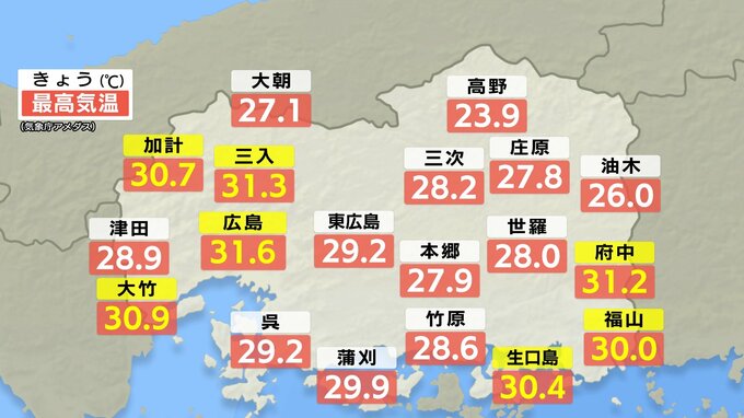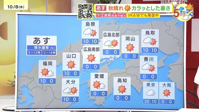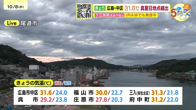 きょう8日(水)の広島県内は、晴れたり曇ったりと変わりやすい空模様でした。最高気温は30℃前後の地点が多くなり、きょうは県内7地点で真夏日を記録しました。広島市中区では31.6℃ 三入では31.3℃を記録しています。きょうは24節気では「寒露」です。暦の上では、夜が長くなり露が冷たく感じられる頃です。過ごしやすさを感じられる日も多くなってきましたが、季節の進みは遅いですね。