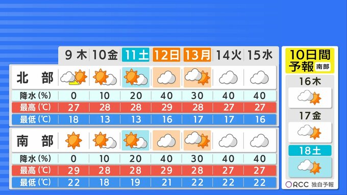 土曜日にかけておおむね晴れるでしょう。日曜日以降はすっきりしない天気が続く見込みです。最高気温は28℃前後の日が多く、厳しい残暑が続くでしょう。最低気温も平年より高い傾向が続きますが、北部では金曜日~土曜日が12℃から13℃の予想です。北部や内陸部を中心に一日の寒暖差が15℃近くになるため、寒暖差で体調を崩さないようご注意ください。