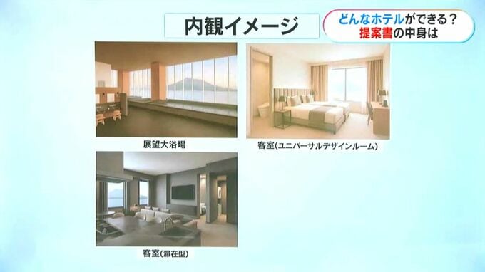(4)6つのタイプの客室が計画されていて、国籍や性別などに関わらず全ての人が快適に過ごせるような「ユニバーサルデザインルーム」やスイートルーム。さらに桜島を望む展望大浴場も予定されているということです。