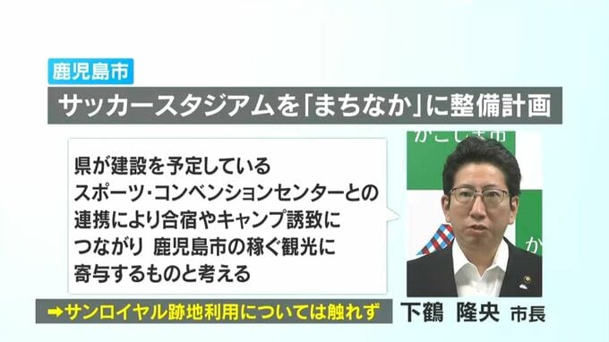 一方、鹿児島市は、サッカースタジアムを「まちなか」に整備するため候補地を選定していて、下鶴市長はサンロイヤルホテルの跡地について「まちなかにあたる」という認識です。