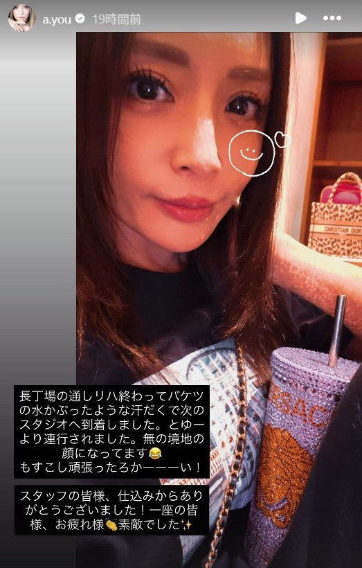 投稿されたのは、浜崎さんがTシャツ姿で、ストローを挿したドリンクを持ってカメラを見つめている画像。この画像に浜崎さんは、「長丁場の通しリハ終わって バケツの水かぶったような汗だくで次のスタジオへ到着しました。とゆーより連行されました。無の境地の顔になってます」と、綴っています。