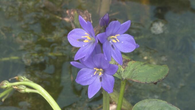 山口県萩市の観光スポット「北の総門」そばの堀で、ミズアオイの花が見頃を迎えています。