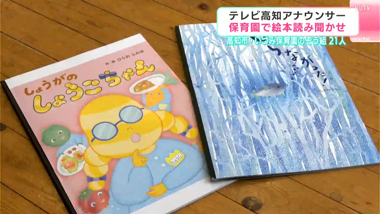 訪れたのは高知市の「いづみ保育園」。年長のぞう組の園児21人と一緒に絵本を楽しみました。読んだのはテレビ高知が開いた絵本コンクールの受賞作品、「しょうがのしょうこちゃん」と、「しらなかった!」の2冊。どちらも、自分に魅力がないと悩んでいた主人公たちが様々なものと触れ合うことで自身の魅力に気づく話です。