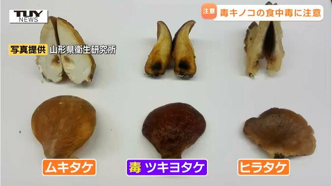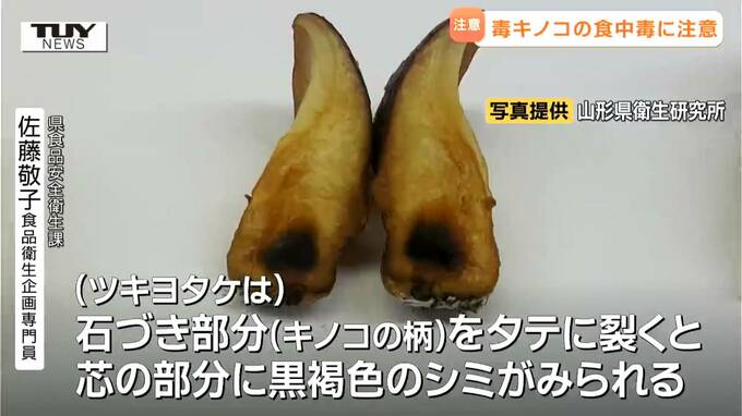 県食品安全衛生課 佐藤敬子 食品衛生企画専門員「(ツキヨタケは)石づき部分(キノコの柄)をタテに裂くと芯の部分に黒褐色のシミがみられる」