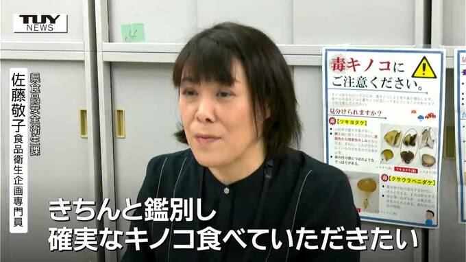 県食品安全衛生課 佐藤敬子 食品衛生企画専門員「食べられるキノコと確実に判断できない場合は、採取しない・食べない・人にあげないことが大事。焼いたら大丈夫、干したら大丈夫、そういうことは迷信ですのできちんとと鑑別し、確実なキノコ食べていただきたい」