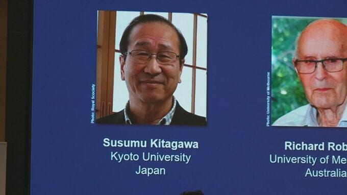 さきほど、今年のノーベル化学賞の受賞者が発表され、京都大学の北川進副学長(74)が選ばれました。 北川副学長は無数の細かい孔があいた「多孔性材料」を開発したことで知られ、ガスを吸着するこの新しい素材…