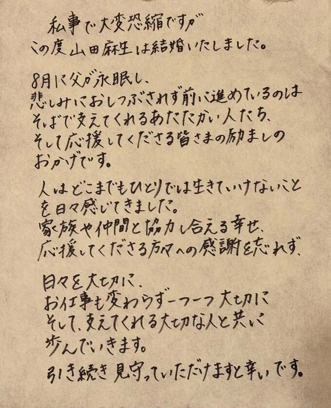 山田さんは「私事で大変恐縮ですがこの度山田麻生は結婚いたしました。」と単刀直入に報告。「8月に父が永眠し、悲しみにおしつぶされず前に進めているのは」「そばで支えてくれるあたたかい人たち、そして応援してくださる皆さまの励ましのおかげです。」と、父である元プロ野球選手の山田和利さんが亡くなったことを振り返り、周囲の支えに思いを馳せています。