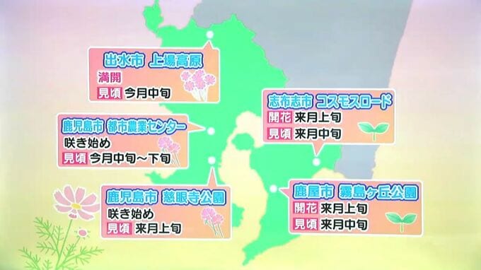 ご紹介した出水市の上場高原は満開で、見頃は今月中旬までです。鹿児島市の都市農業センターは咲き始め、今月中旬から見頃になりそうです。