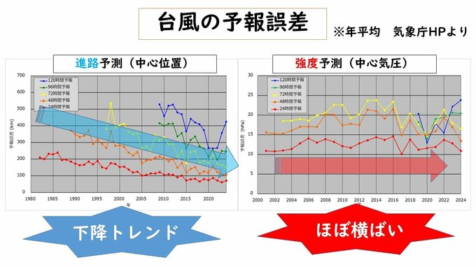 コンピュータの発達などでは、「進路の予測」に関しては、中心位置のずれが小さくなり、改善されていますが、「強度の予測」精度はほぼ横ばいで、強さの予測はあまり改善されていません。