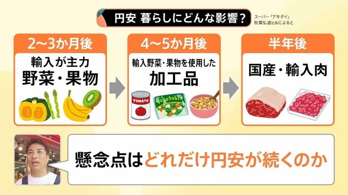 スーパー「アキダイ」の秋葉弘道社長は、スーパーの売り物の値段に「今すぐ影響はでない」とした上で、今後“3段階”で影響がやってくるのではないかとしています。