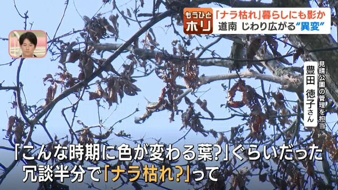 「函館の見晴公園です。この公園は紅葉スポットとしても人気を呼んでいるのですが、公園内のナラ類の木を見てみると枯れてしまっています」