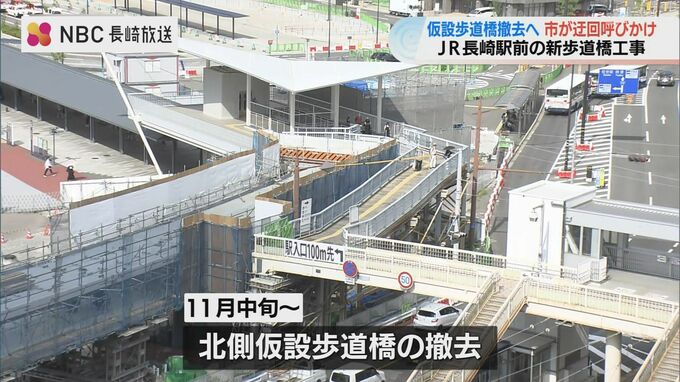 長崎市がJR長崎駅東口で進める新しい歩道橋の工事で、現在設置されている仮設の歩道橋が今月以降、順次撤去されるのに伴い、市は利用者に迂回を呼びかけています。