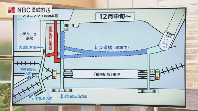 今月中旬には南側の仮設歩道橋がアミュプラザ長崎本館2階の入口まで延伸され一部が撤去されるほか、来月中旬からは北側の仮設歩道橋が撤去され新しい歩道橋の一部が利用できるようになります。