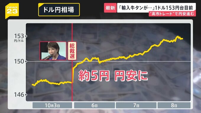 8日、円相場は一時153円台目前まで値下がりしました。要因の一つが、高市氏が掲げる物価高対策です。