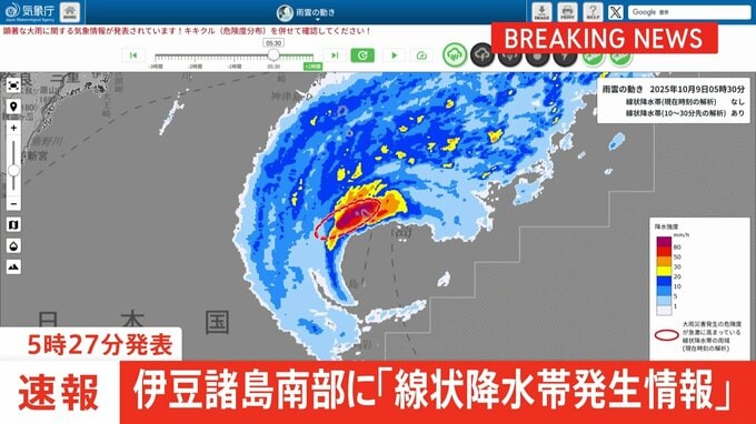 気象庁は午前5時27分、伊豆諸島南部に「線状降水帯発生情報」を発表しました。この情報が発表された地域では、線状降水帯によって同じ場所で非常に激しい雨が降り続いていて、命に危険が及ぶ土砂災害や浸水、河川…