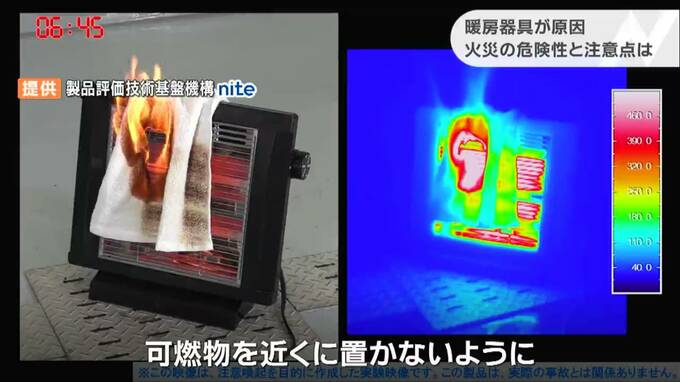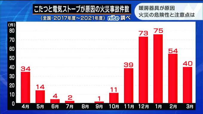 NITEがまとめた、こたつと電気ストーブが原因の火災の件数です。11月から件数が増え始め、12月と1月にピークを迎えます。暖房器具が欠かせなくなるこれからの時期、火災を起こさないよう、暖房器具は注意して使う必要があります。