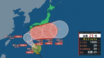 気象庁によりますと、台風23号は、きょう(9日)午前9時には日本の南にあって、1時間におよそ20キロの速さで北北西へ進んでいます。中心の気圧は1000ヘクトパスカル、中心付近の最大風速は20メートル、…