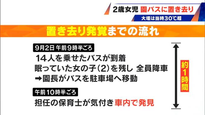 置き去りが判明するまでの流れはこうです。午前9時半頃に到着した通園バスには園児14人が乗っていました。この際、2歳の女の子は眠っていて、他の園児を先に降ろし、園長がバスを駐車場に移動。約1時間後に女の子が園内にいないことに気付き担任の保育士がバスの中で見けました。健康被害はありませんでした。