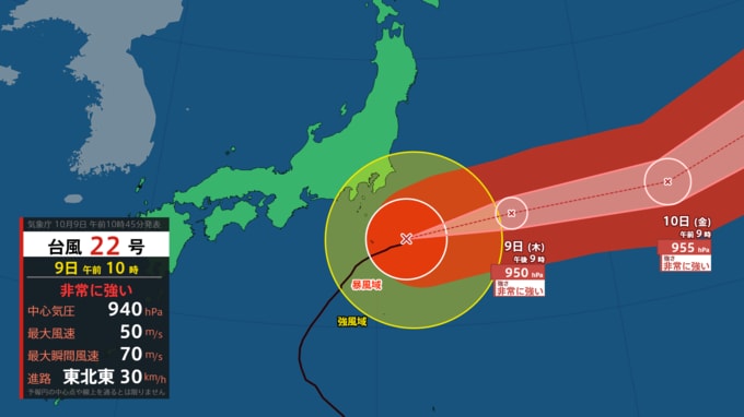 気象庁によりますと、非常に強い台風22号は、9日10時には八丈島の東にあって、1時間におよそ30キロの速さで東北東へ進んでいます。中心の気圧は940ヘクトパスカル、中心付近の最大風速は50メートル、最大瞬間風速は70メートルで中心から半径165キロ以内では風速25メートル以上の暴風となっています。