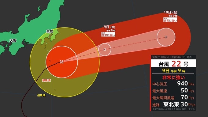 台風22号は「非常に強い」勢力を維持したまま、伊豆諸島を通過しました。伊豆諸島には『特別警報』が発表され『線状降水帯』が断続的に発生しています。八丈島では最大瞬間風速54.7mを観測し、電柱が倒れる被害も出ています。