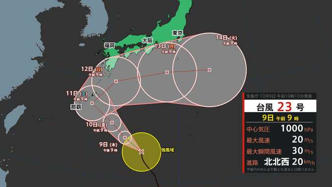 台風23号の予報円は、きのう8日(水)までの予想より「沖縄に近いコース」に変わってきました。