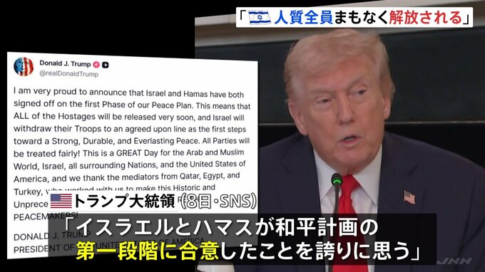 アメリカのトランプ大統領は、パレスチナ自治区ガザをめぐる和平計画について、イスラエルとイスラム組織ハマスが「第一段階」に合意し、「すべての人質がまもなく解放される」と発表しました。トランプ大統領は8…