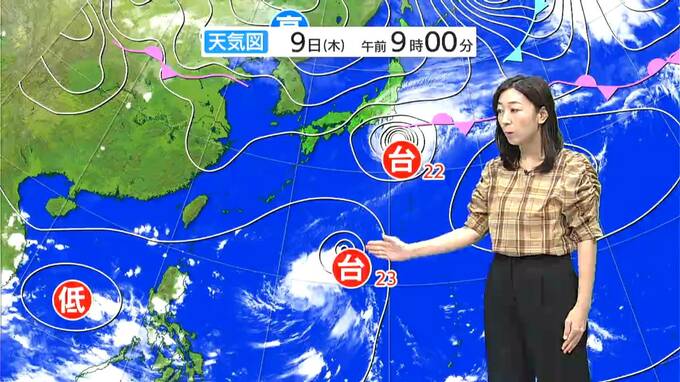 次に台風23号です。こちらは土曜日から日曜日に奄美地方から九州南部付近に北上、その後東寄りに進む予想です。