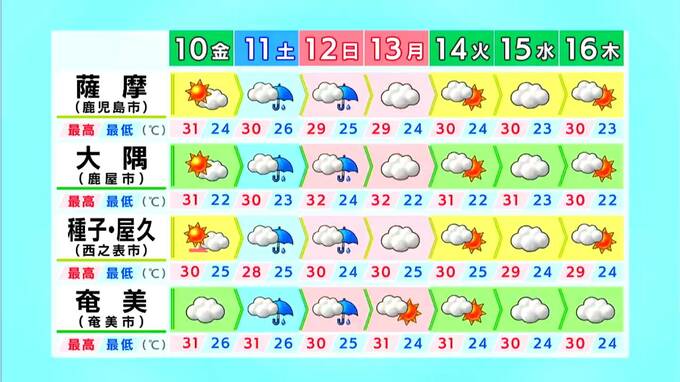 奄美地方で予想される最大風速は、10日は15メートル。11日は20メートルで、奄美地方以外薩摩、大隅、種子島・屋久島地方でも風が強まるおそれがあります。県内各地、大雨・強風、高波に注意をしてください。