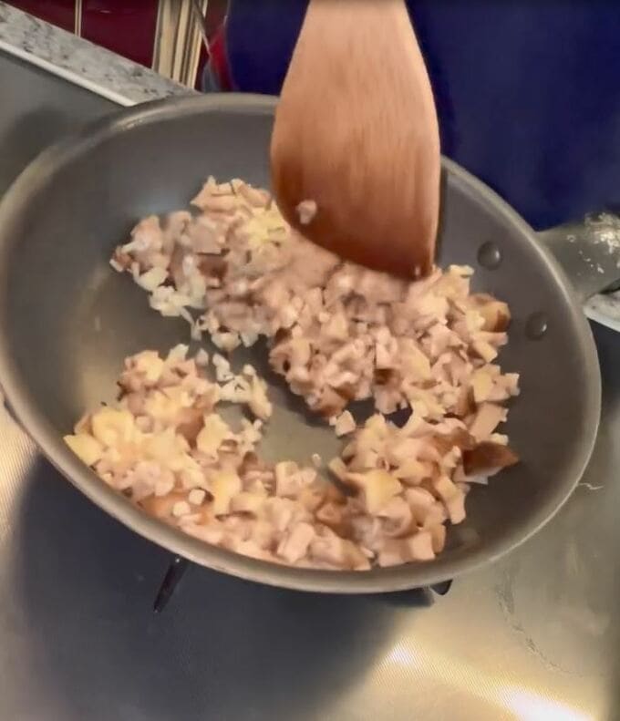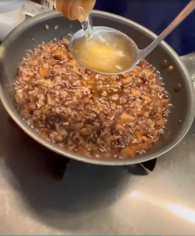 動画では、水で戻した干し椎茸をみじん切りにして、フライパンで炒めながら、鷹の爪やゴマ、みりん、ゴマ油などを加えていく様子が紹介されています。