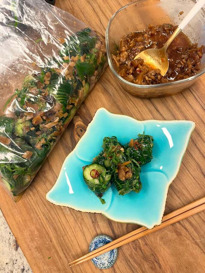 完成したお新香の素を使った料理の写真もあわせて投稿し、「一度お新香の素を作ってしまえば、塩もみしたきゅうりにかけたり、お肉やサラダ! かなり重宝します。」と、その万能ぶりをアピールしています。