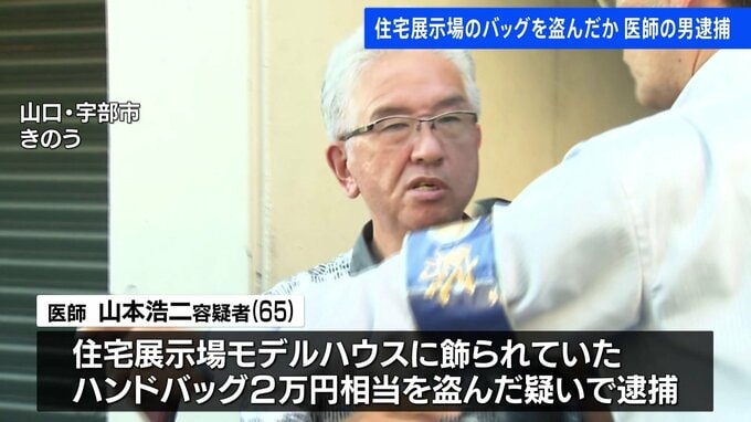 窃盗の疑いで逮捕された山口県宇部市の医師・山本浩二容疑者(65)は、住宅展示場のモデルハウスに飾られていたハンドバッグ2万円相当を盗んだ疑いがもたれています。警察の調べに「返すつもりだった」と容疑を否…