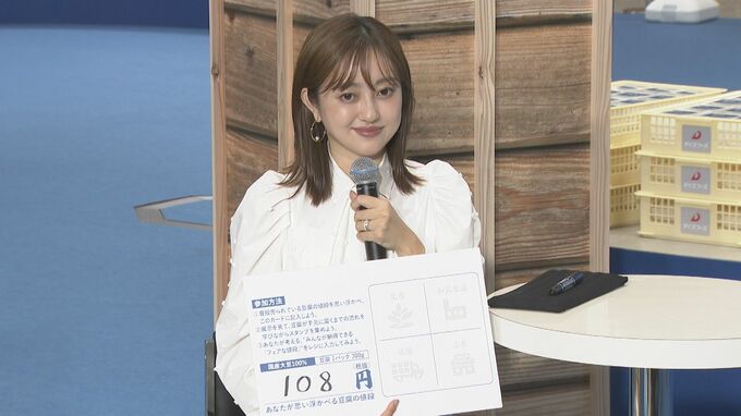 豆腐を買うときのポイントは、“一番最初に見るのは正直、値段”だという菊地さん。値付け体験では、国産大豆が使われた豆腐1丁の価格を「108円」と値付けしました。“普段80円90円の豆腐も買うんですけど、国産大豆を使っているなら(この値段かな)…「110円」と迷ったんですけど、2円の差。主婦って2円でも安い方がいいじゃないですか!”と主婦としての顔もちらり。