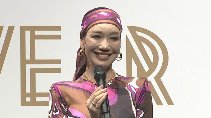 ファイナルステージ審査員長のアンミカさんは、ビビットなピンクとブラウンの模様が印象的なワンピースに、お揃いの柄のターバンを巻いたひときわ目を引く衣装で登場。アンミカさんは、“今年はブラウンのグラデーションとか「レトロ」が来てるので詰め込んでみた。フリンジも来るので、ゴールドの小物と合わせて、レトロな雰囲気で”とアピール。