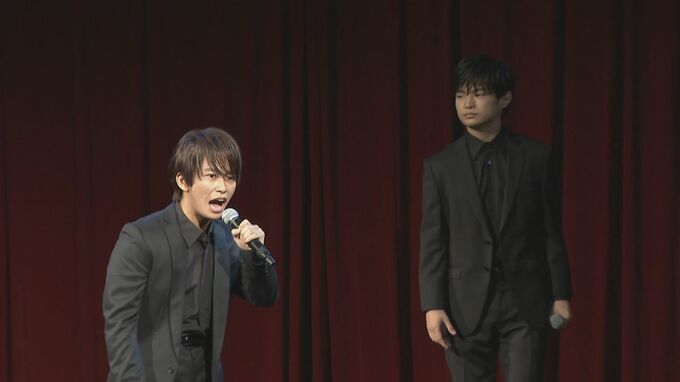 製作発表の冒頭、主人公の「夜神月(やがみ・ライト)」役を演じるダブルキャストの加藤さんと渡邉さんは、本編で歌われる楽曲「デスノート」を、2人で歌唱するスペシャルバージョンで披露。この日訪れた観客120人を一気にその世界観に引き込み、魅了しました。