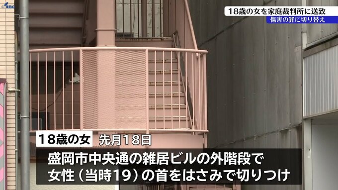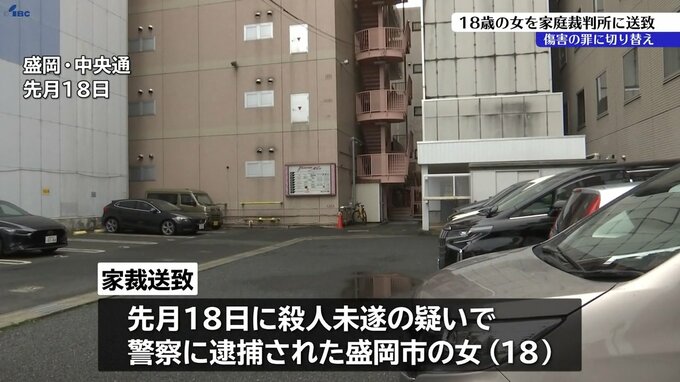9月に盛岡市で女性の首を切り付け殺害しようとしたとして、殺人未遂の疑いで逮捕された18歳の女について、盛岡地検は9日、傷害の罪に切り替えて家庭裁判所に送致しました。