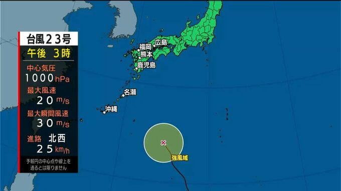 台風23号の情報です。奄美市の南東700キロの海上にあって、時速25キロで北西に進んでいます。中心の気圧は1000hPa、中心付近の最大風速は20m、最大瞬間風速は30mとなっています。