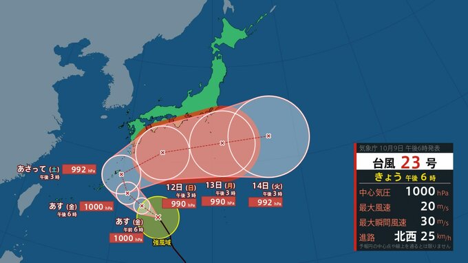 気象庁によりますと、台風23号は、きょう(9日)午後6時、日本の南を時速25kmの速さで北西へ進んでいます。