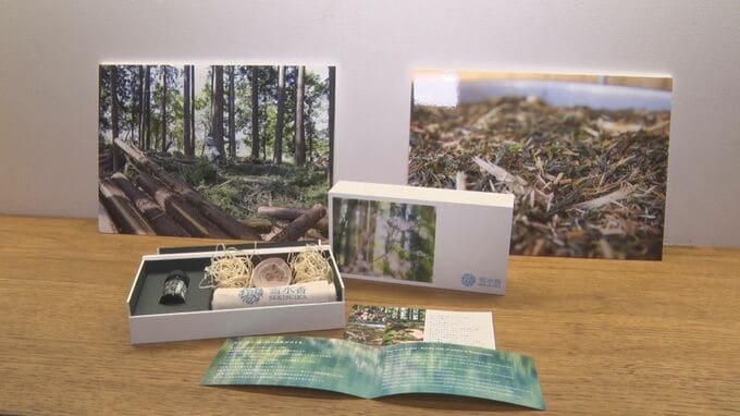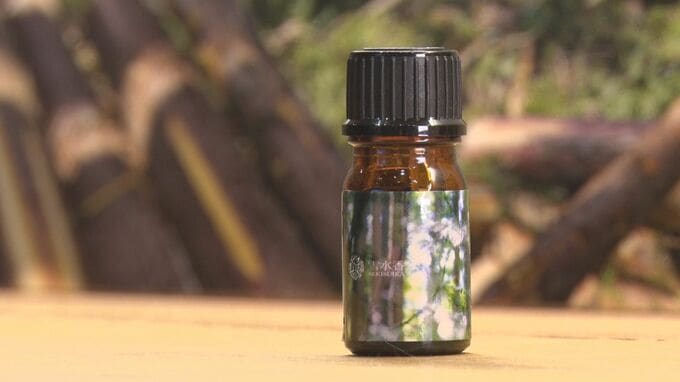 さわやかな香りが特徴のアロマオイルのセットは、山ノ内町で伐採されたスギの枝や葉から抽出したオイルと、ラベンダーなどのハーブのオイルがブレンドされています。