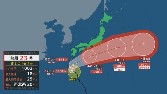 【台風情報】台風23号(ナクリー)は週末に南西諸島や九州に 12日(日)から13日(月)は再び伊豆諸島に接近 伊豆諸島では暴風に厳重警戒を 最新の進路予想と雨と風シミュレーション 北陸放送 2025年10月10日(金) 16:39 国内 台風23号は、台風22号と似たような進み方をたどりそうです。 一方で、最も北よりを進むと、西日本や東日本の太平洋側で雨や風の強まり方が増すおそれがあります。最新の台風の情報に注意をするようにしてください。