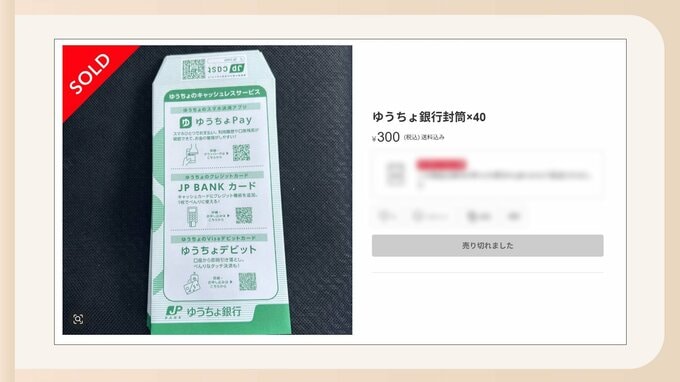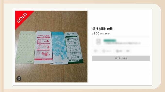 他にも…ゆうちょ銀行と別の金融機関の封筒を150枚にしてセットにしたものも300円で出品されて、こちらもすでに売り切れでした。